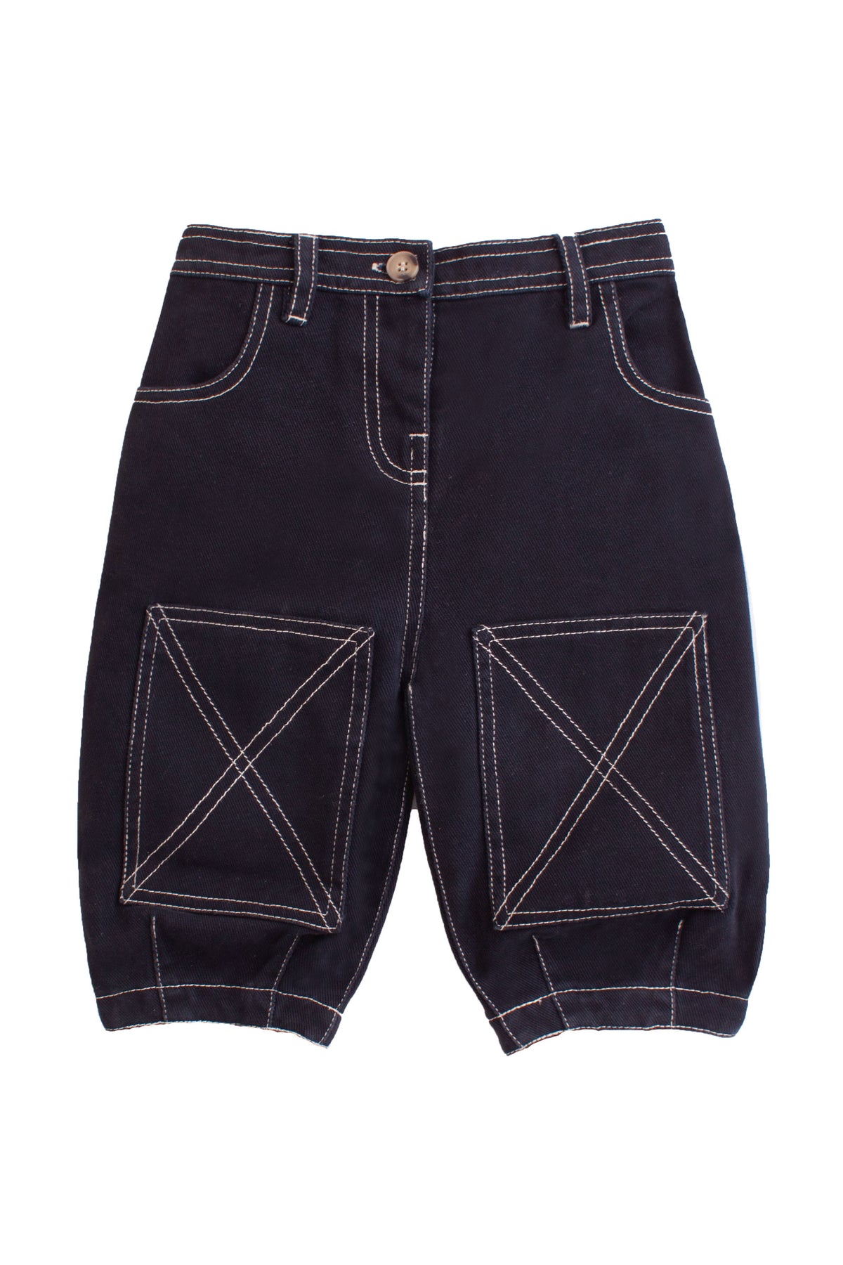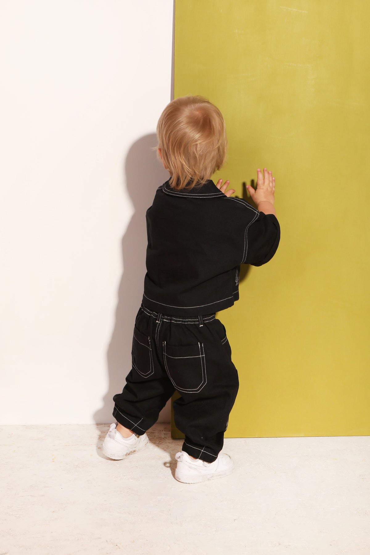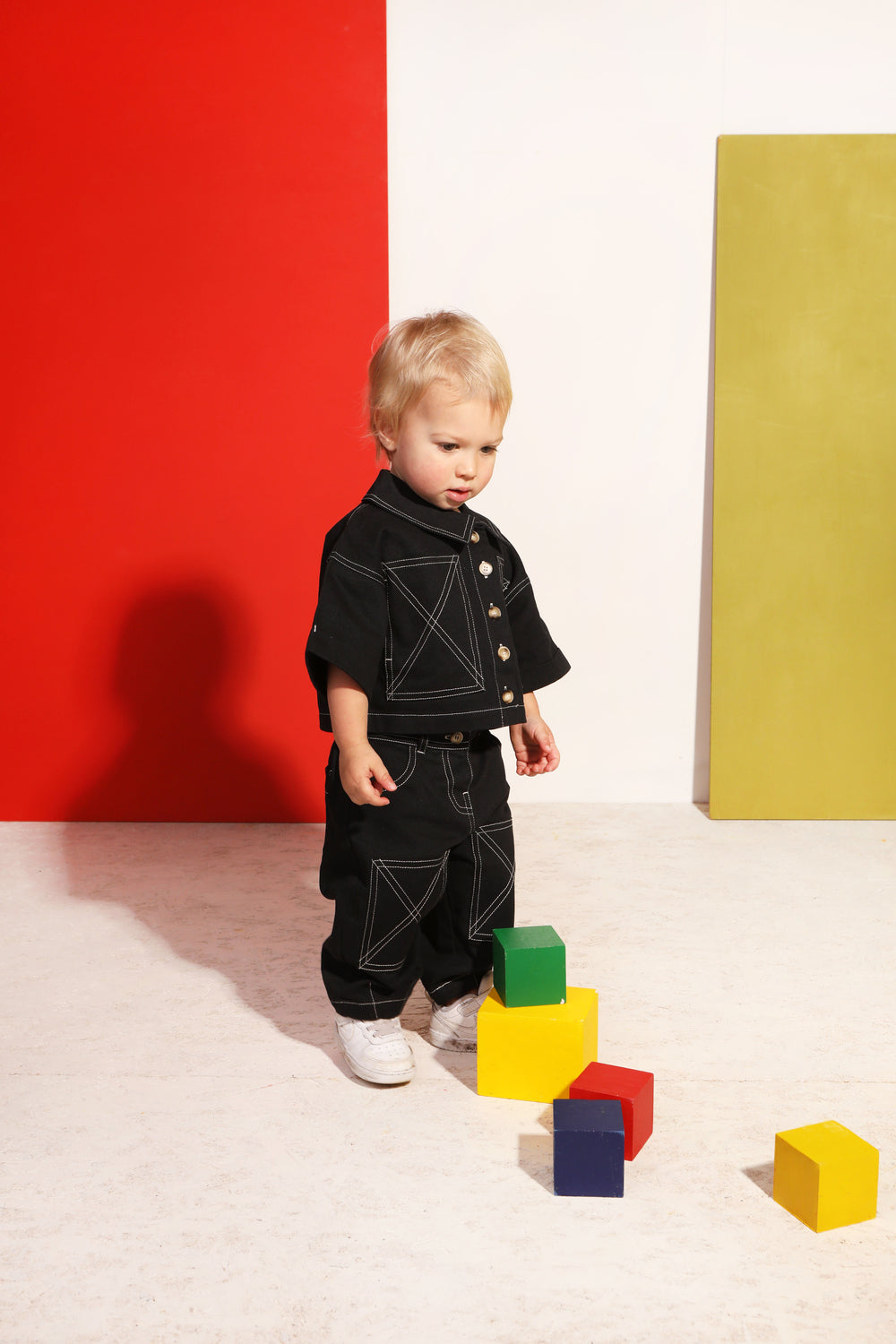 The Jarvas Trouser have a tapered leg and elastic on the back of the waist. With patchwork detailing on the knees. Comes in black with white contrast stitching.  100% cotton, sturdy and durable. Machine wash cold with similar colours. Marlow is 24 months and is wearing a size 1-2 years. Worn with the Rod Jacket.