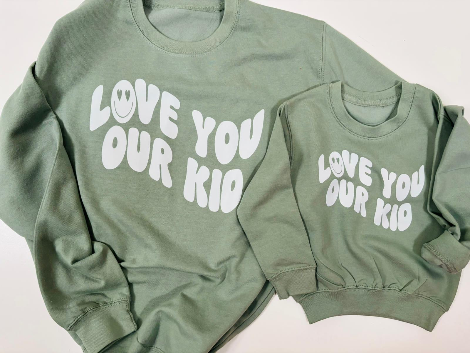 Our Albie ‘Love You Our Kid’ oversized sweatshirt for adults in cool green